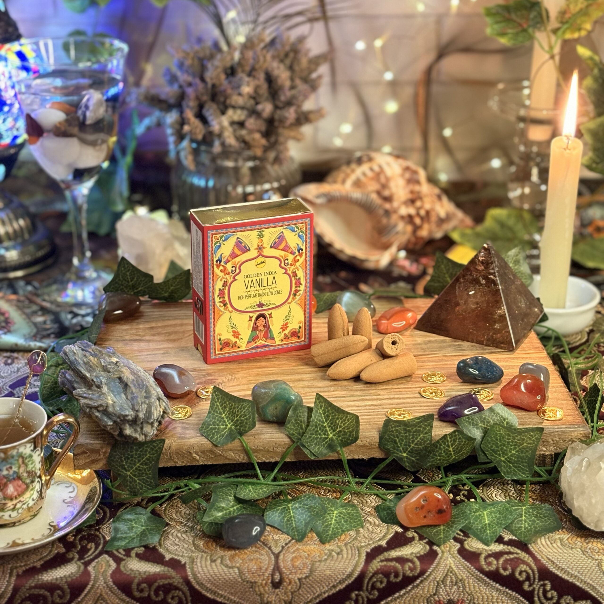 O incenso Cone Indian Heritage Vanilla é produzido com a tradicional mistura indiana de ervas, resinas e óleos aromáticos, trazendo uma fragrância suave e envolvente.