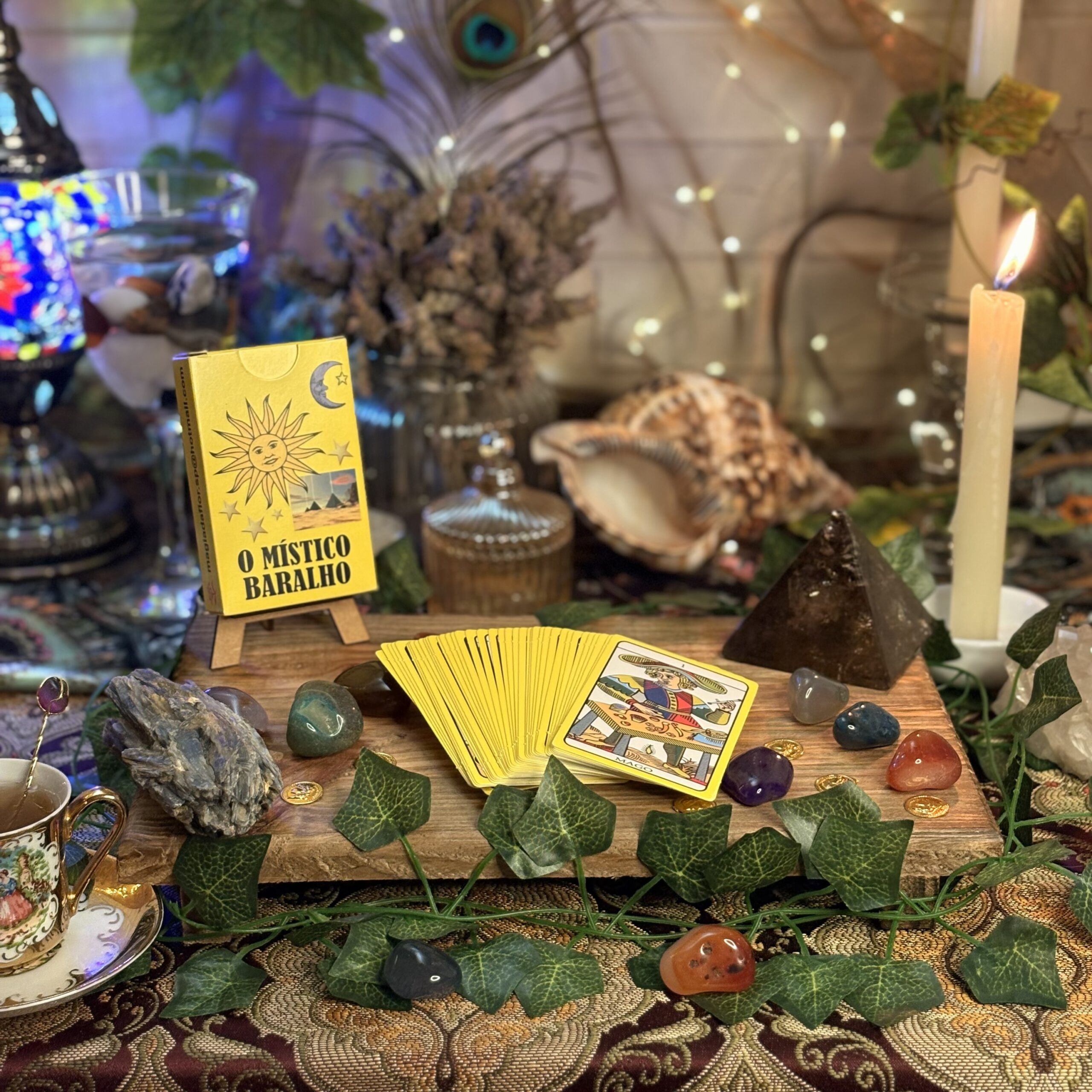 O Místico Baralho é um tarô inspirado no tradicional estilo de Marselha, trazendo cartas com simbologia clássica para leituras diretas e objetivas.